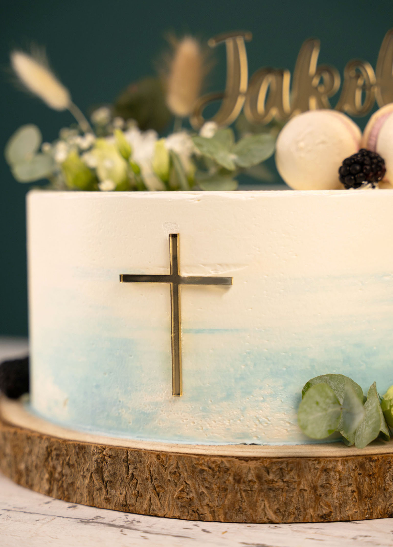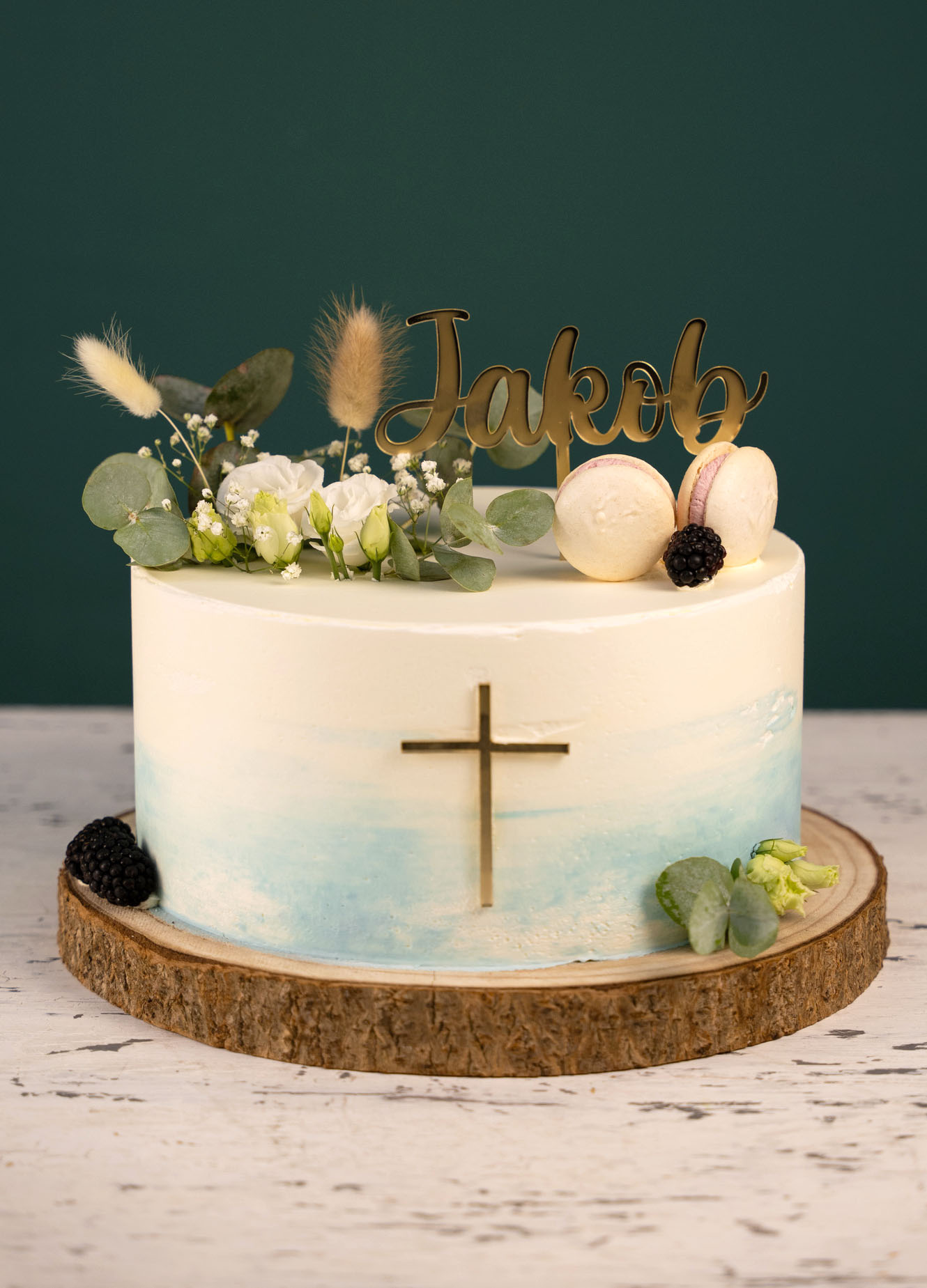 Mit frischen Blumen, Macarons und einem goldenen Kreuz seitlich an der Torte dekoriert ist diese Torte das perfekte Highlight für besondere kirchliche Anlässe.