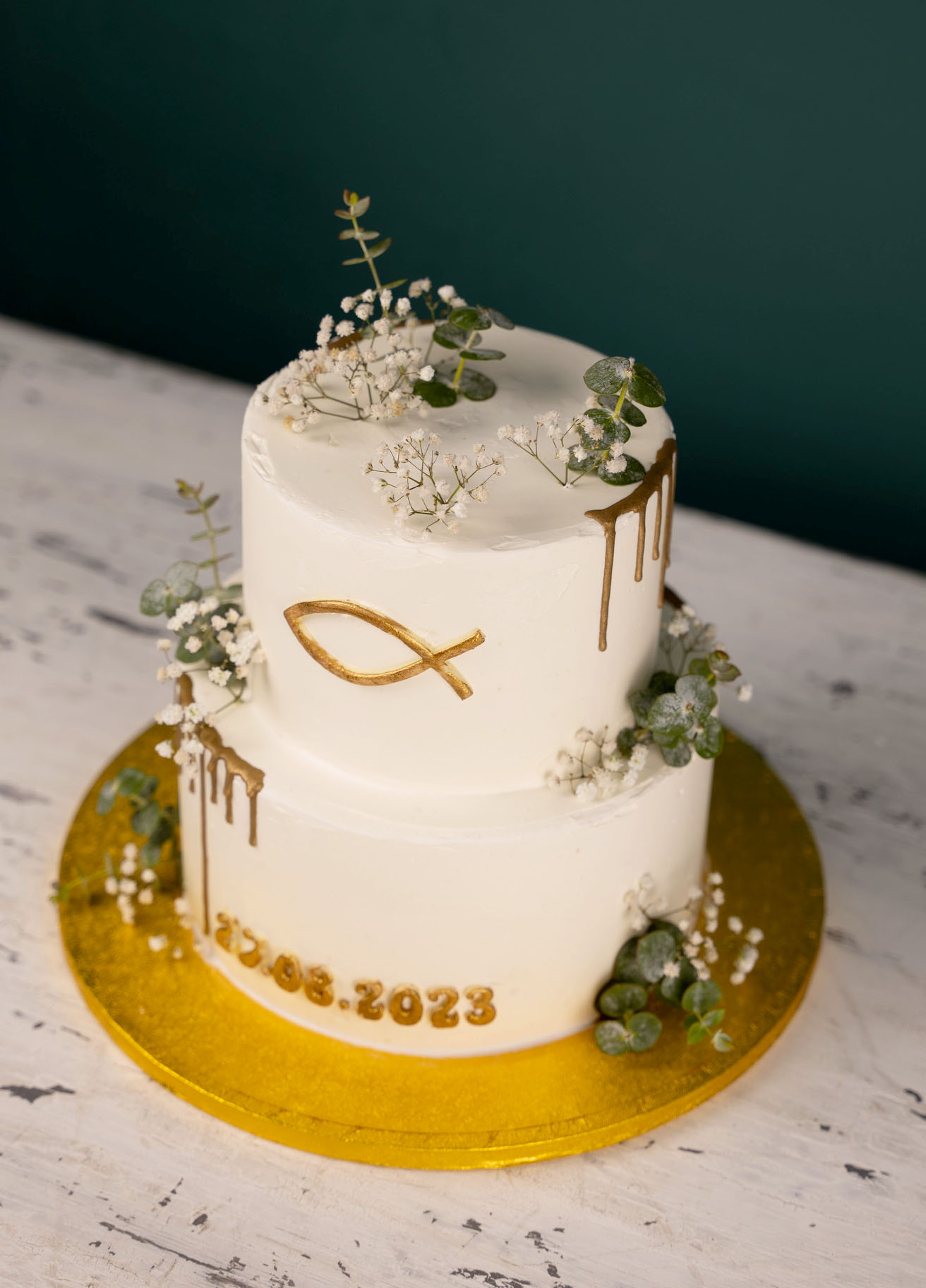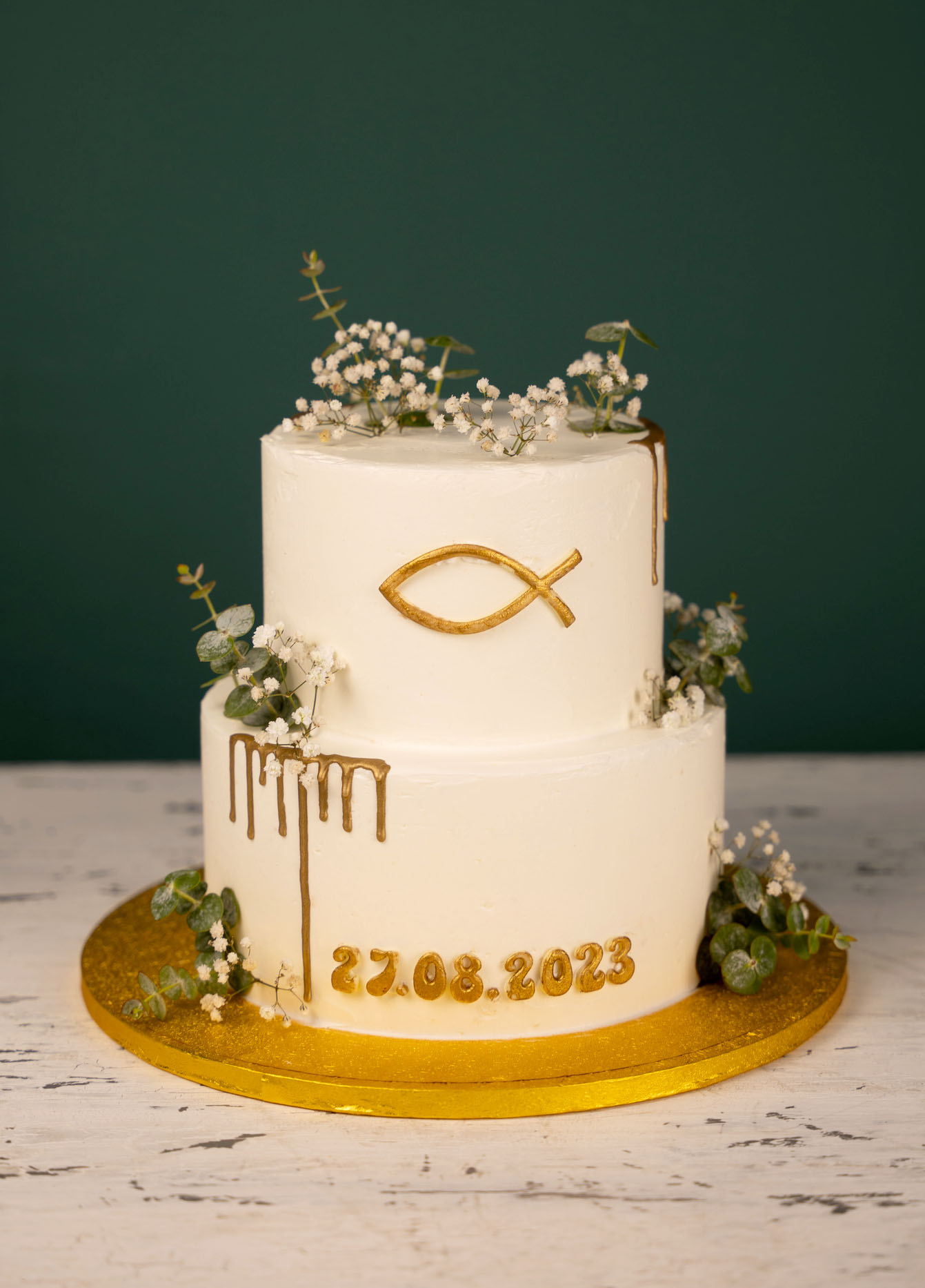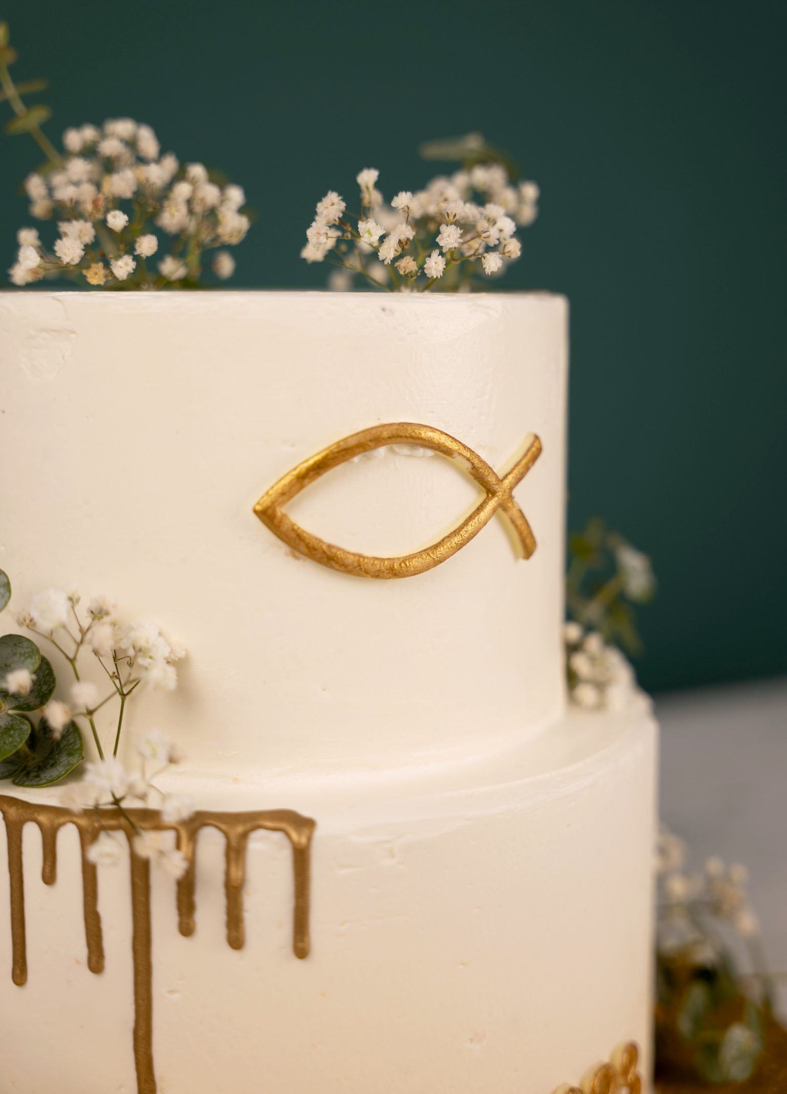 Liebevoll dekoriert mit goldenen Elementen ist diese Torte ein Highlight auf jeder christlichen Feier.